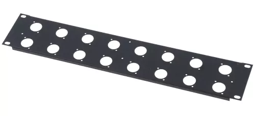 Flanszowany, 1,5mm stalowy panel z otworami. Pokrycie czarnym, matowym lakierem. Otwory wykonane w standardzie XLR-D.