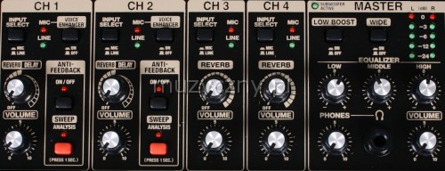 • kontrolery KANAŁ 1/2: przycisk Input Select (Mic, Line), przycisk Voice Enhancer, przycisk Anti-Feedback, potencjometr Reverb/Delay, potencjometr Volume, KANAŁ 3/4: przycisk Input Select (Mic, Line), przycisk Phantom, potencjometr Reverb/Delay, potencjometr Volume