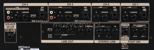 • złącza KANAŁ 1/2: MIC (XLR/ 1/4 cala), Line L (Mono), R jack (1/4 cala), Line L,R jack (RCA), STEREO LINK: In jack (1/4 cala), Out L,R (1/4 cala), LINE OUT: złącze zbalansowane L,R (XLR), L(Mono), R jack (1/4 cala), Phones jack (Stereo, 1/4 cala), Speaker Out jack (1/4 cala), Anti-Feedback jack (1/4 cala), Exp Pedal jack (1/4 cala).