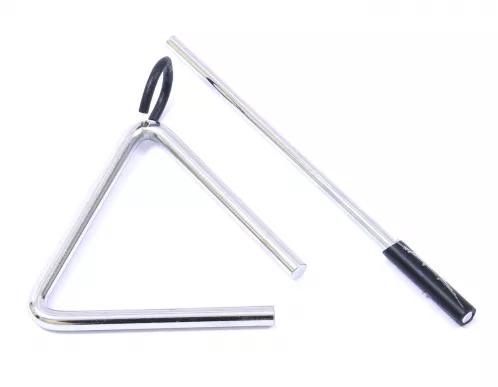 Aluminiowy trójkąt, otwarty w jednym rogi, z dodatkowym uchwytem i pałeczką. Emituję typowo wysoki, czysty dźwięk. Doskonale sprawdzi się w każdym stylu muzycznym.