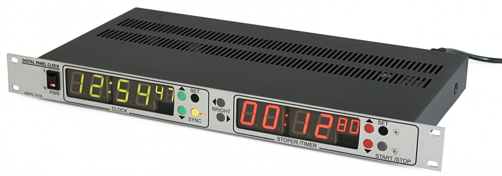 Zegar NDPC101A przystosowany jest do instalacji w systemie modułowym 19". Może jednocześnie realizować dwie funkcje: wskazuwanie aktualnego czasu oraz pełni rolę stopera/timera. Urządzenie wyposażone jest w złącze umożliwiające podłączenie zewnętrznych modułów do synchronizacji czasu - odbiornika DCF-77 lub GPS. Ponadto NDPC101A, za pośrednictwem magistrali RS485, wysyła informację o aktualnym czasie oraz bieżącym stanie stoper/timer.