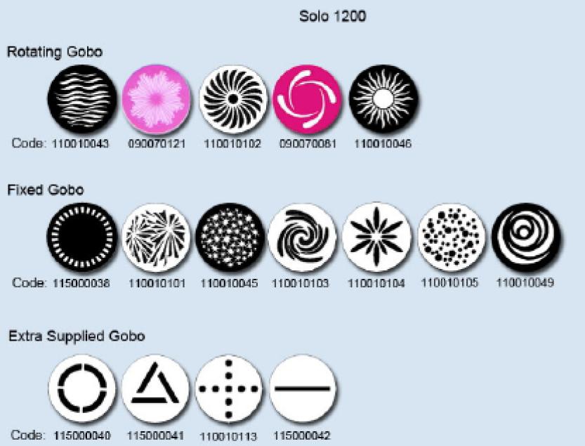 7 wymienialnych gobo + biały, indeksowane, dwukierunkowa rotacja przy zmiennej prędkości
