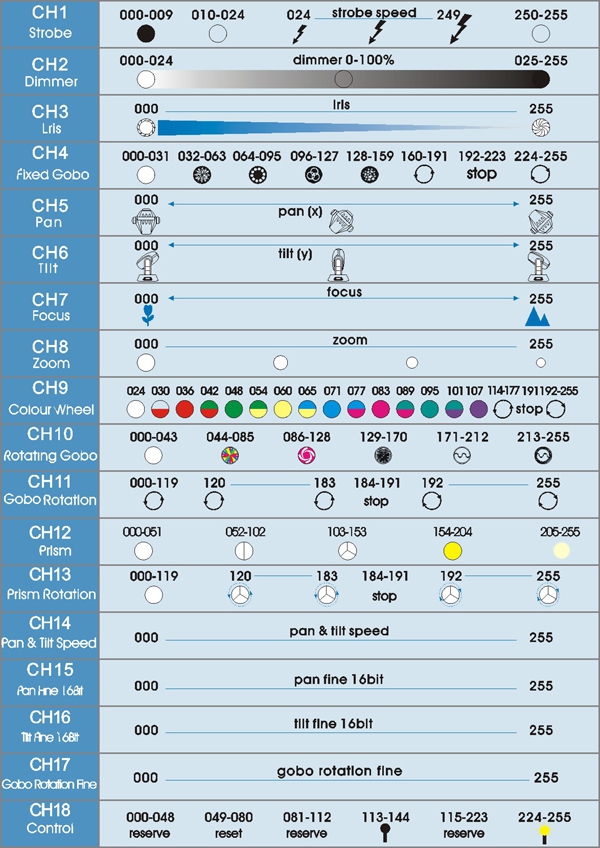 1 tarcza kolorów, 6 kolorów dichroicznych plus biały; ustawialna prędkość, dwukierunkowa rotacja, efekt tęczy; liniowa lub krokowa zmiana kolorów