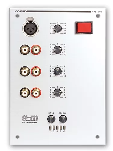 APS-440-A02, jednostka zdalnego sterowania do instalacji. Mikser/przedwzmacniacz dla 4 wejść bezpośrednich. 2 wejścia mikrofonowe (-63 dBm / zbalansowane), przełączane zasilanie phantomowe, 2 wejścia AUX (-10 dBm / asymetryczne). Oddzielne regulatory głośności dla każdego wejścia. Sterowanie tonami niskimi i wysokimi dla sygnału sumarycznego. Miernik LED VU do sygnalizacji poziomu. Podświetlany klucz do włączania i wyłączania centrum sterowania systemu APS. Rezerwa miejsca na dodatkowe przyciski funkcyjne. Dostępny w wersji poziomej lub pionowej.
