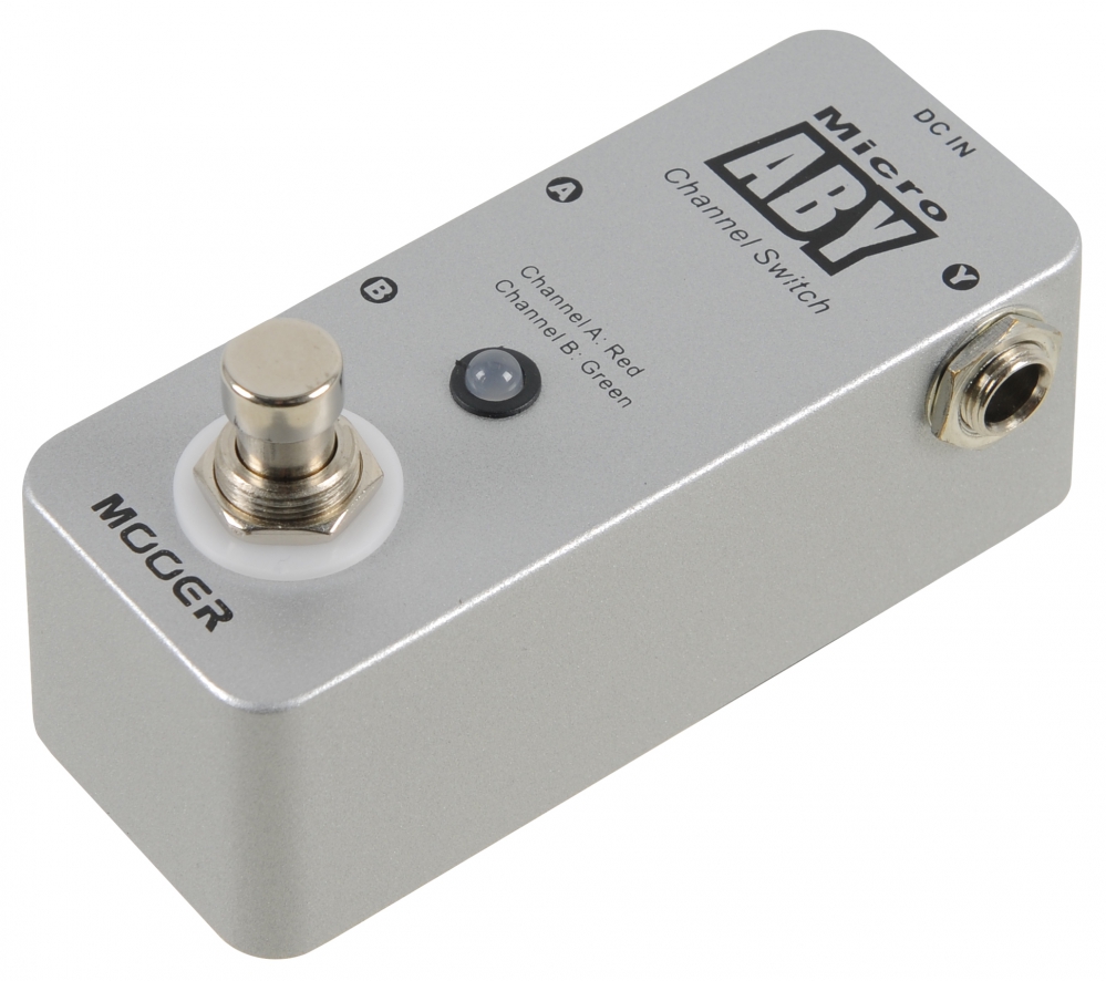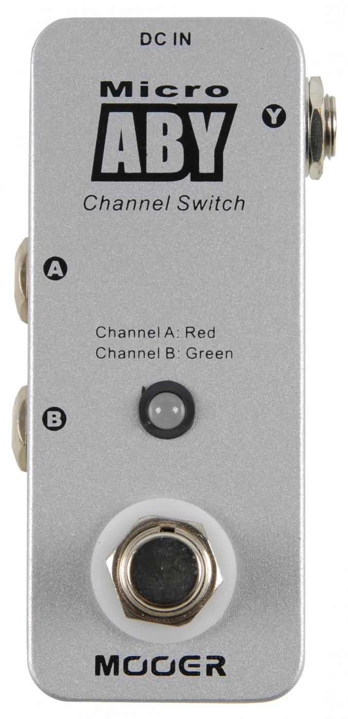 Mooer Micro ABY to prosty przełącznik toru sygnałowego mogący pracować w dwóch układach: jedno wejście do dwóch wyjść lub dwa wejścia do jednego wyjścia.