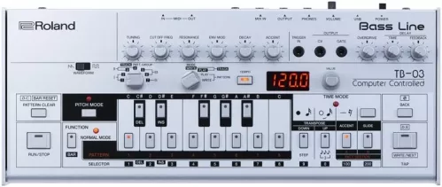 Zasilany bateryjnie TB-03 jest bezpośrednim potomkiem słynnego syntezatora TB-303 Bass Line. Układ i elementy sterowania nie zmieniły się, więc działa, jak oryginał. Brzmi również tak samo, dzięki zaawansowanej technologii ACB, odtwarzającej hipnotyczne rytmy magicznej srebrnej skrzynki. Ale nowy TB-03 idzie nawet dalej, dzięki kilku ulepszeniom, których nie ma w modelu oryginalnym. Czterocyfrowy wyświetlacz LED ułatwia programowanie i zwiększa dokładność, natomiast efekty Overdrive i Delay pozwalają wyzwolić zakręconą ścianę dźwięku, doprowadzając tłum do szału. Będąc w studiu, TB-03 może wysyłać informacje sterujące poprzez system MIDI lub port USB; ten drugi pełni również funkcję interfejsu audio o parametrach 24 bity/96 kHz.