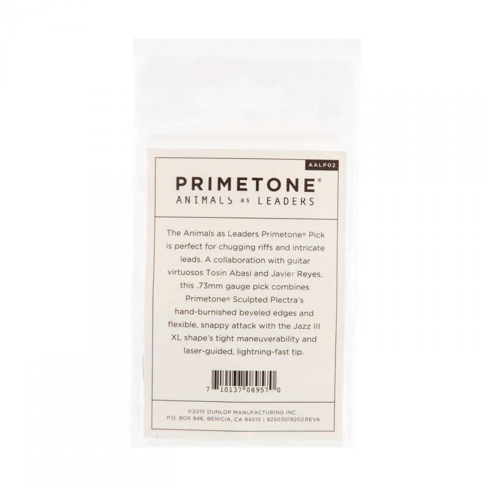 Kostka Animals as Leaders Primetone? jest idealna do ostrych riffów i zawiłych partii leadowych. We współpracy z wirtuozami gitary; Tosinem Abasim i Javierem Reyesem, ta kostka o grubości .73 mm łączy w sobie ukośne, ręcznie profilowane krawędzie kostki Primetone Sculpted Plectra z poręcznością i elastycznym, punktowym atakiem szybkiej, laserowo profilowanej końcówki kostki Jazz III XL.