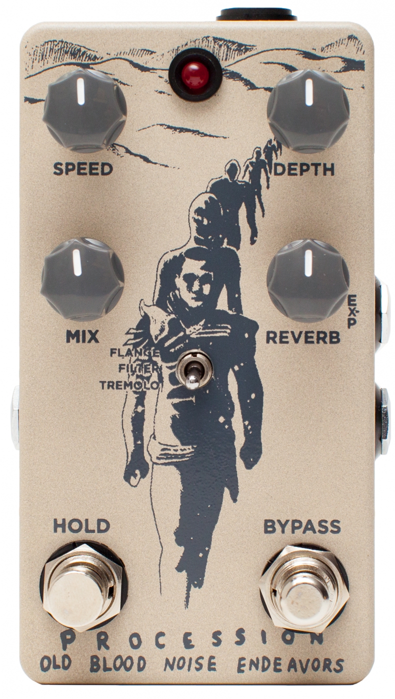 Czujesz, że z niewyraźnej jak pisakowa burza oddali, coś zaczyna się wyłaniać. Lekko i powoli kieruje się w Twoim kierunku. Dostrzegasz to, a jednak za chwilę znika i odbija sie echem w otwartej przestrzeni, niczym hulający wiatr. To efekt Procession. Dźwięki innego świata. Miesjce do którego zmierza pogłos Procession firmy Old Blood Noise Endeavors. Jest to bowiem efekt którego użylibyśmy do niejednego filmu science fiction. Dziwna mieszanka prześladujących nas pogłosów oraz trzech opcji modulacyjnych. Procession to próba zainicjowania czegoś nowego, zarazem alternatywnego ale i na pograniczu dreszczyka emocji. Procession posiada proste opcje kontroli, zapewniające szybką regulację reverbu, od prostego echa po złożone i pokręcone brzmienia SciFi. Pokrętła Mix i Reverb nadzorują mix sygnału dry/wet oraz wygaszanie reverbu. Sterowanie gałkami Speed I Depth przypisane jest do odpowiednich trybów: Flange, Filter czy Tremolo. Procession wyposażono w dwa przełączniki nożne. Przełącznik Bypass to standardowy guzik on/off dla True Bypass. Natomiast, przełącznik Hold działa tylko w momencie naciśnięcia i zamraża aktualnie grane przez nas nuty w pogłosie, do czasu zwolnienia przycisku.