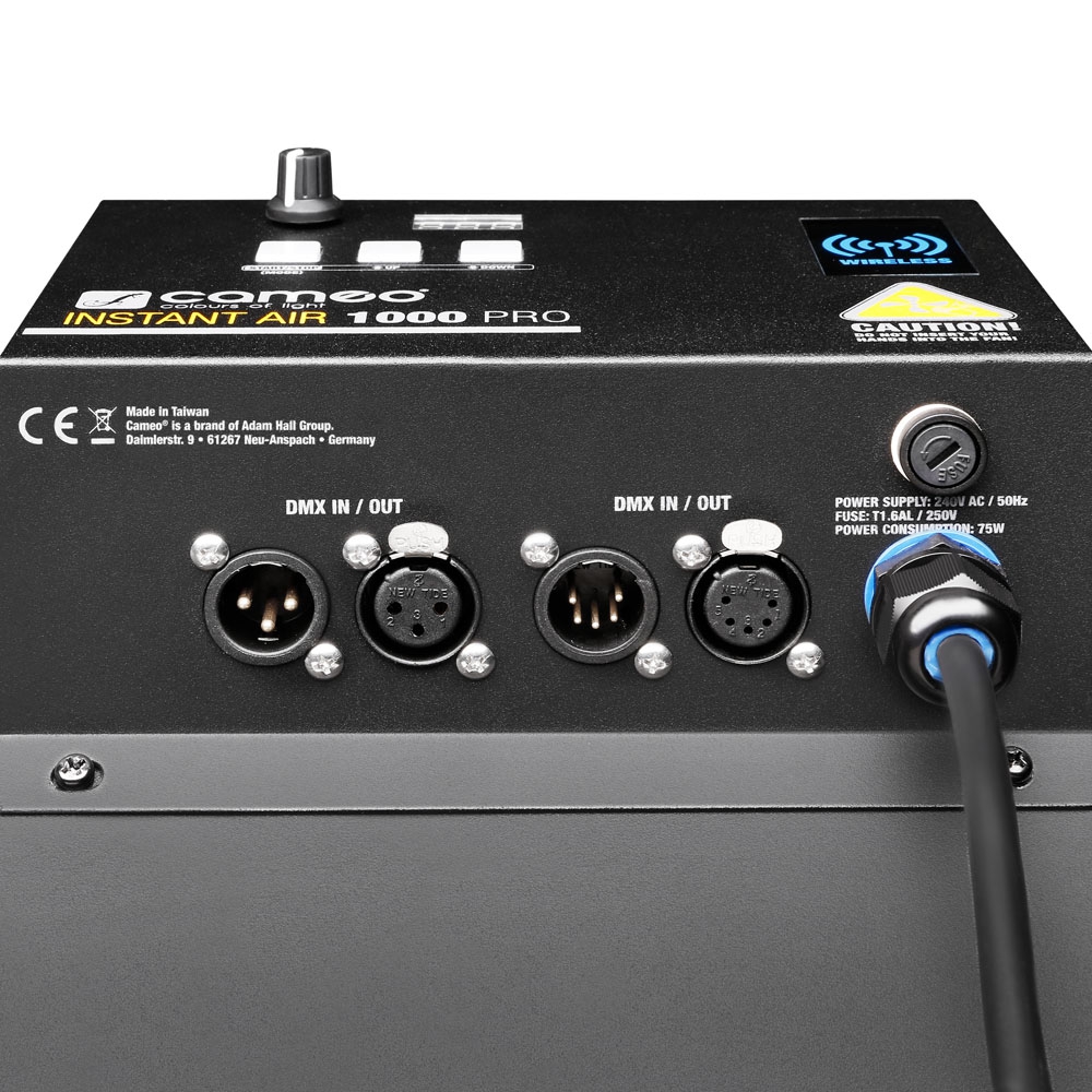 Instant Air 1000 z serii Cameo Instant to niezwykle wydajny wentylator przeznaczony do użytku w teatrach, na pokazach mody, w filmach, klubach, dyskotekach, parkach rozrywki oraz koncertach na żywo. Wentylator generuje maksymalny strumień powietrza o wydajności 25 m³ na minutę, a procentowa skala regulatora mocy nawiewu pozwala na osiągnięcie licznych efektów od delikatnych podmuchów po silne uderzenia wiatru. Kąt nawiewu ustawia się bezstopniowo aż do 180°, co pozwala na ustawienie precyzyjneg o strumienia powietrza lub szerokiej dyfuzji sięgającej aż do 21 metrów.