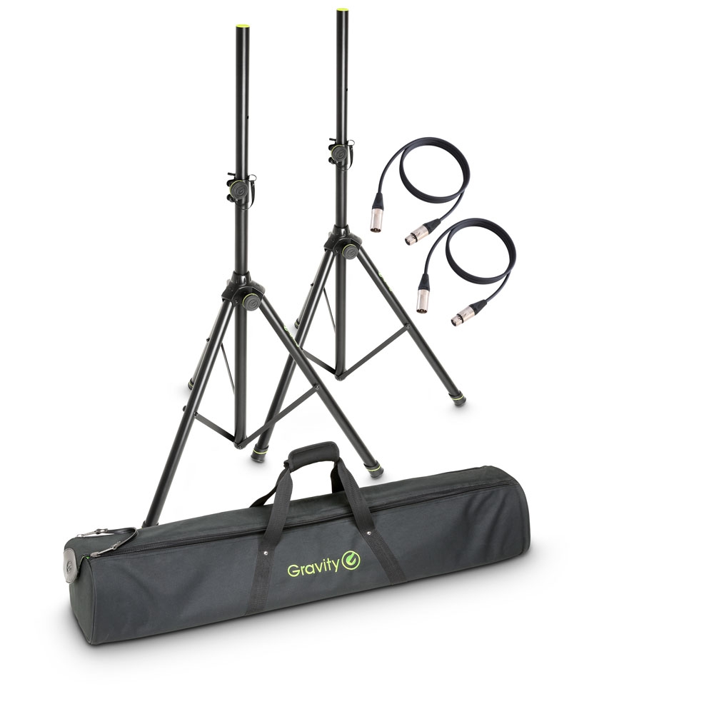 Zestaw ten zawiera statywy głośnikowe Gravity GSP5211B, solidną, grubo wyściełaną torbę GBGSS2B, umożliwiająca wygodny transport, oraz dwa symetryczne kable mikrofonowe o długości 5 m z wtyczkami XLR.