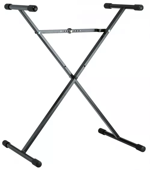 Statyw keyboardowy, skonstruowany w stylu X z dodatkowymi pozycjami blokowania. Posiada szybkie i łatwe w konfiguracji składanie. Dzięki unikalnemu mechanizmowi, stojak z łatwością reguluję się na wybraną wysokość i szerokość. Dodatkowo stabilne, materiałowe podkładki podtrzymują statyw zapewniając 100% bezpieczeństwo instrumentowi.