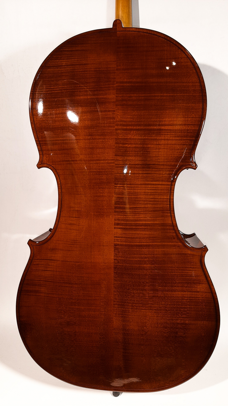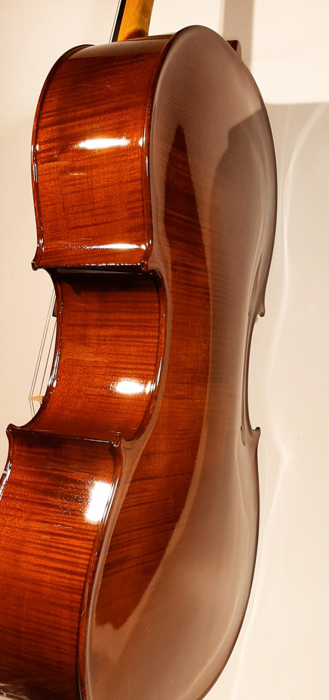 Model Linz - Sam instrument wykonany jest z drewna pochodzenia europejskiego, góra z selekcjonowanego litego świerku, boki i tył z litego klonu falistego, z podstawkiem Aubert oraz strunami Thomastik Spirocore, lakier spirytusowy.