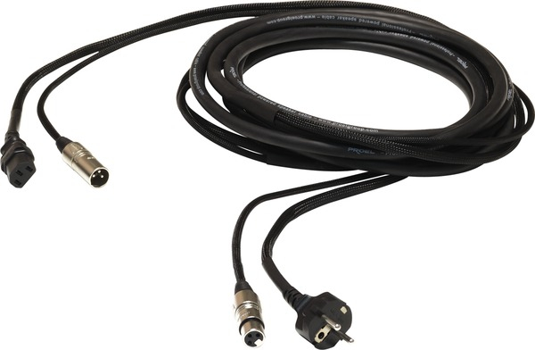 Profesjonalny przewód Phono-feed zmontowany z gniazdem żeńskim PROEL XLR 3P, metalową obudową i tylną ścianką + wtyk męski SCHUKO 16A - przewód zasilający 3 x 1,5mm2 - wtyk męski PROEL XLR 3P, metalową obudową i tylną ścianką + złącza żeńskie 3P w standardzie EC. Długość: 5 m. Dostępny w kolorze czarnym.