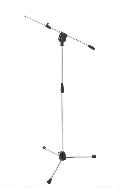 Profesjonalny statyw mikrofonowy z teleskopowym wysięgnikiem, trójnożną aluminiową podstawą i nylonową, sprzęgłową regulacją wysokości.