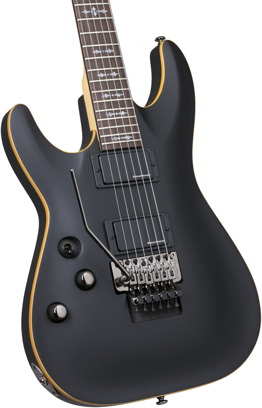 Gitary z serii Demon wyposażone są w dwa aktywne przetworniki Schecter, tunery Schecter i różne mostki. Z czarnym satynowym wykończeniem i jednowarstwowym postarzanym bindingiem w niektórych modelach, te gitary są dla najmroczniejszych dusz! Gotyckie inkrustacje krzyżowe i czarny chromowany osprzęt dopełniają estetyki tej gitary.